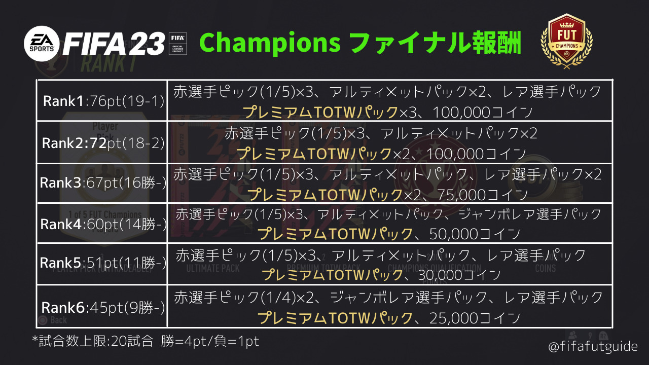 FUT21ではウィークエンドリーグとして、金曜16時~月曜16時までの週末期間に報酬をめぐり30試合を上限に全世界*のプレイヤーが成績を競い合う形でしたが、FUT22よりChampions プレーオフとChampions ファイナルの2つの大会に分かれて進行します。FUT23でも前作と同内容で実施されることが決定しています。